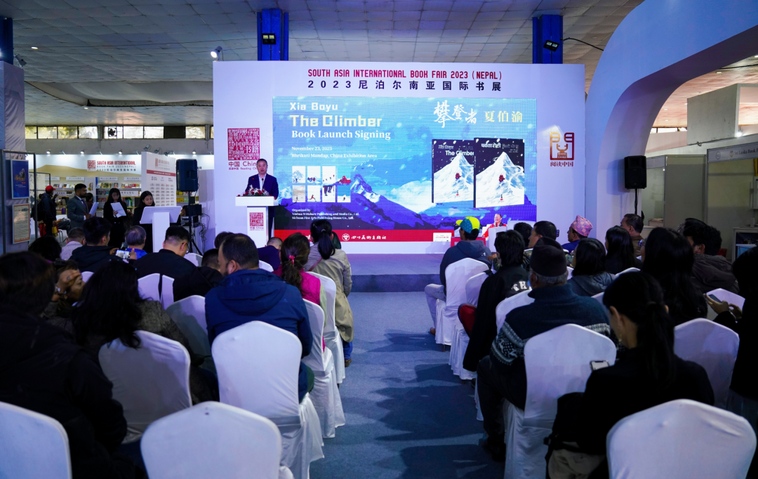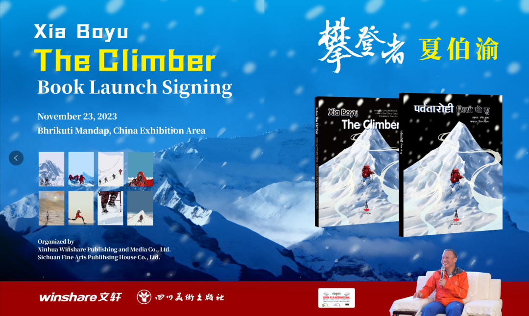 2023年11月23日上午,2023尼泊尔南亚国际书展第三日,《攀登者夏伯渝》(尼泊尔文版)首发式及作者签售会在加德满都尼泊尔书展中国展区成功举行。